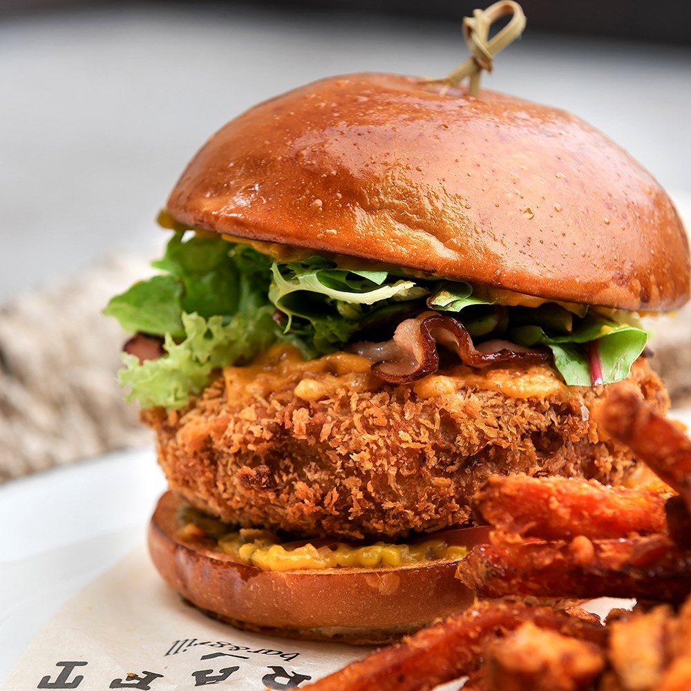 На булочки выкладывается соус релиш из маринованных огурцов и горчицы, помидор, красный лук, микс салата, золотистый жареный бекон и котлета из куриного бедра, панированная в сухарях панко.
