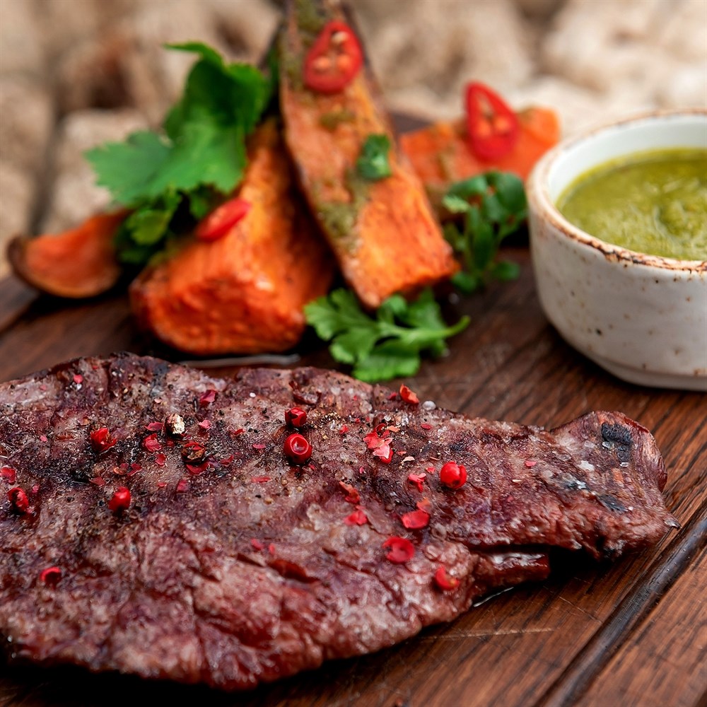 Фланк стейк обжаривается на гриле до прожарки medium и подается с овощами гриль (картофель, перец). Украшается кинзой, слайсом чили, заправкой лайм-кинза.