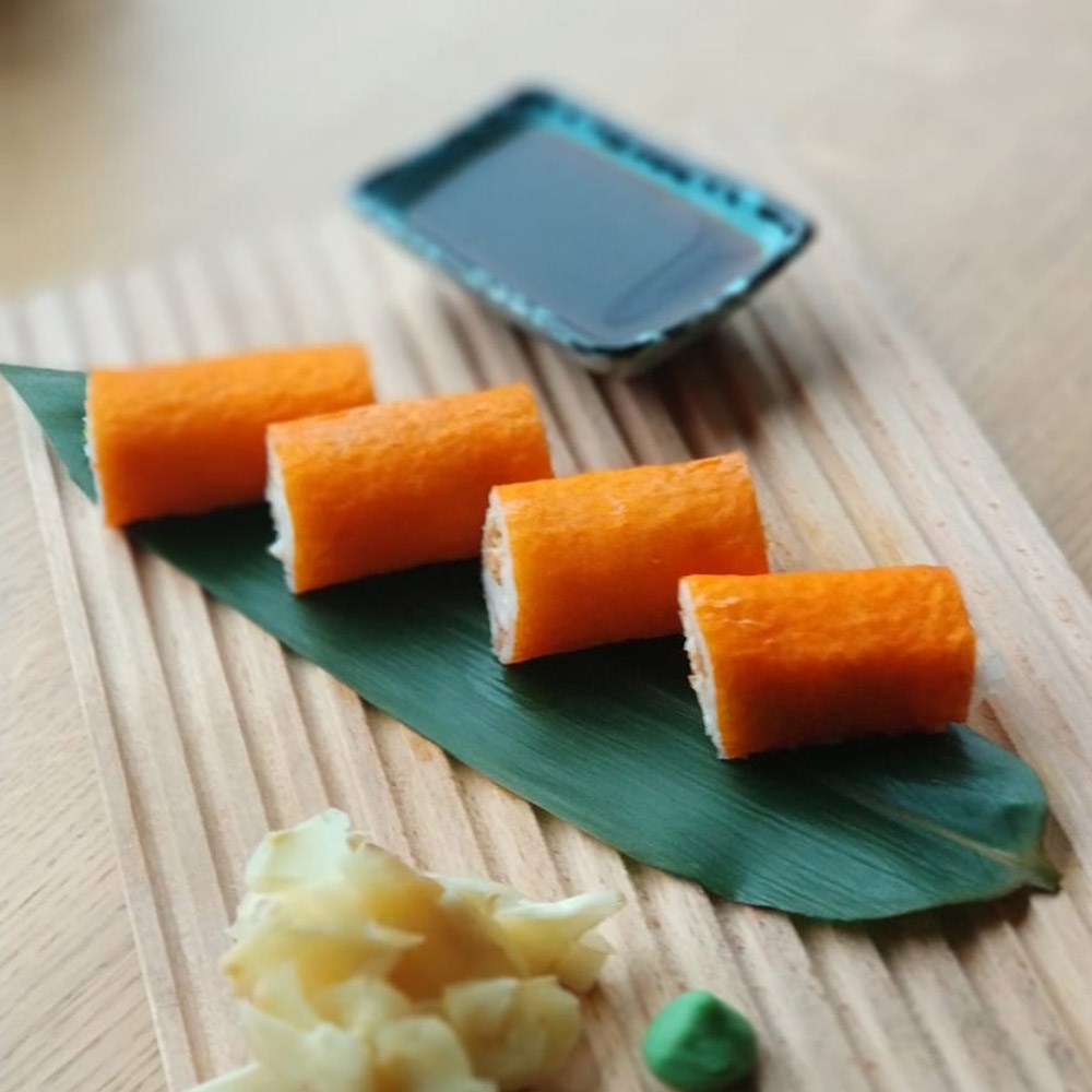 Рис, креветка жаренная, краб, соус спайси, лук зеленый, лук фри, кунжут, кимчи, васаби, обёрнутые соевой бумагой.