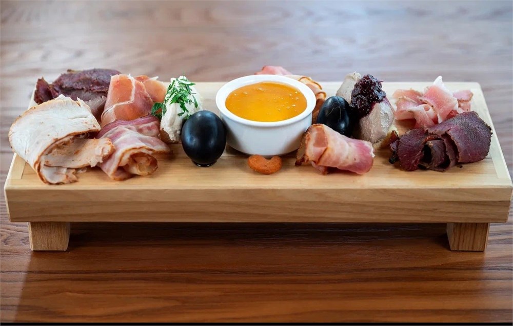 Мясные закуски: ростбиф, пастрами из индейки, хамон, паштет из кролика и куриный паштет. Паштеты подаём на фокачче: три части – паштет из кролика, три части – куриный паштет с анчоусами. Паштет из кролика мы готовим из филе кролика с добавлением репчатого лука, чеснока, можжевеловых ягод, тимьяна и белого вина. Пробиваем со сливками, сливочным маслом и трюфельным. Куриный паштет с анчоусами мы готовим из куриного филе с добавлением репчатого лука, чеснока, анчоусов, розмарина, можжевеловых ягод, тимьяна и белого вина. Пробиваем со сливками, сливочным маслом и трюфельным. Подаём с мёдом и оливками, политыми классической заправкой.