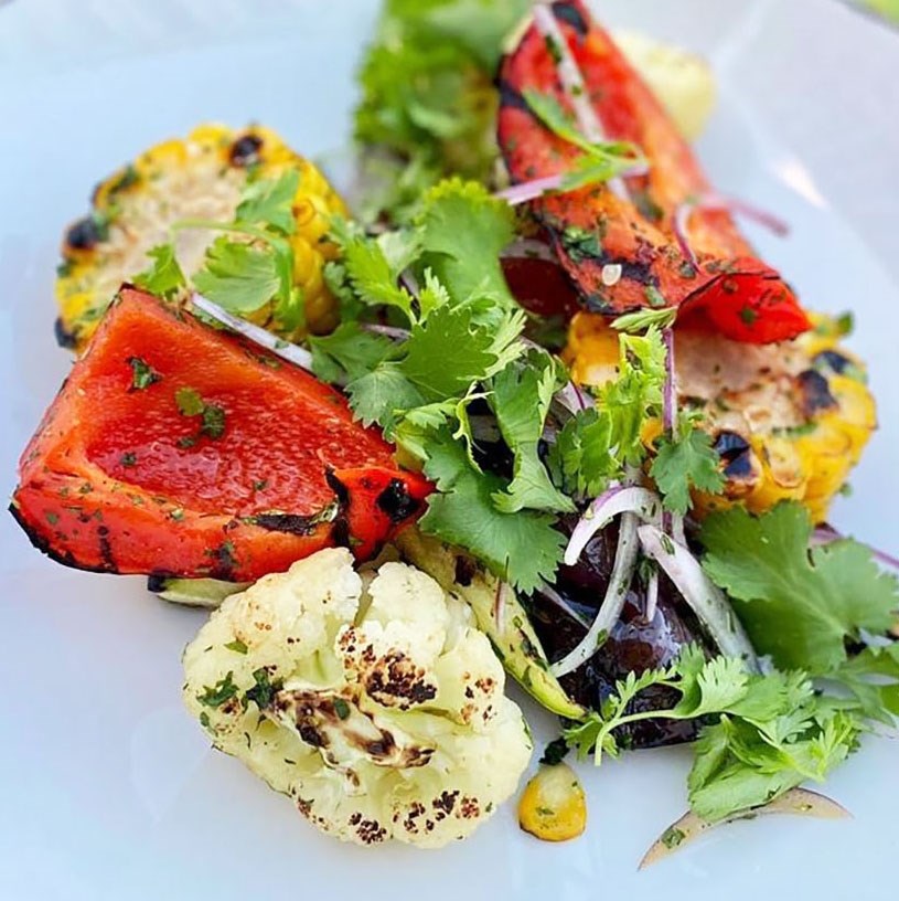 Сезонные овощи, обжаренные в дровяной печи «Josper», подаются с красным луком, кинзой и топленым маслом.