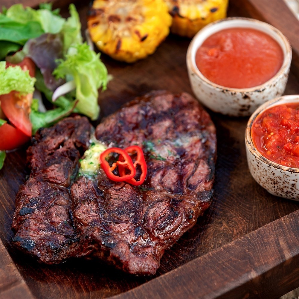 Rib-eye Prime - стейк, имеющий высочайшую степень мраморности. Прожилки равномерно распределены по мясу и делают готовый стейк максимально нежным и сочным. Подается с соусом из запечённых овощей со свежими овощами и зеленью