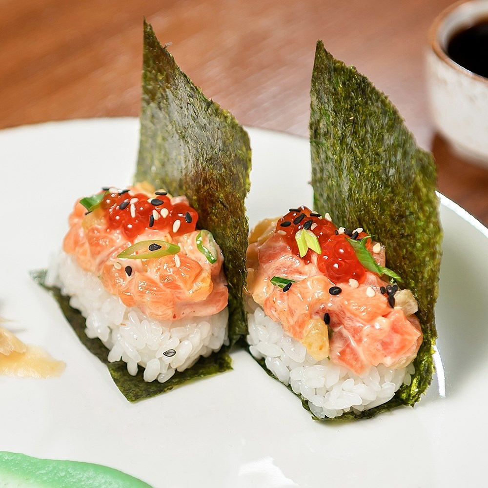 Лосось и манго, нарезанные кубиком, заправляются соусом понзу, спайси, добавляется зеленый лук. Ролл украшается красной икрой и кунжутом.