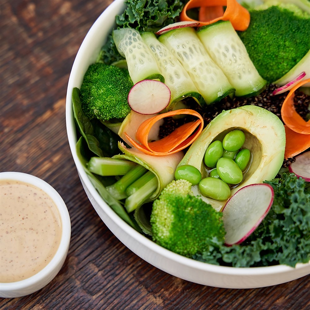 Черное киноа, заправленное заправкой винегрет (оливковое масло, сахар, бальзамический уксус), микс салат, яблоко, стебель сельдерея, кабачок, огурец, шпинат, капуста кейл, брокколи, авокадо, бобы эдамами, морковь и редис. Боус отдельно подается с ореховым соусом, а само блюдо поливается оливковым маслом.
