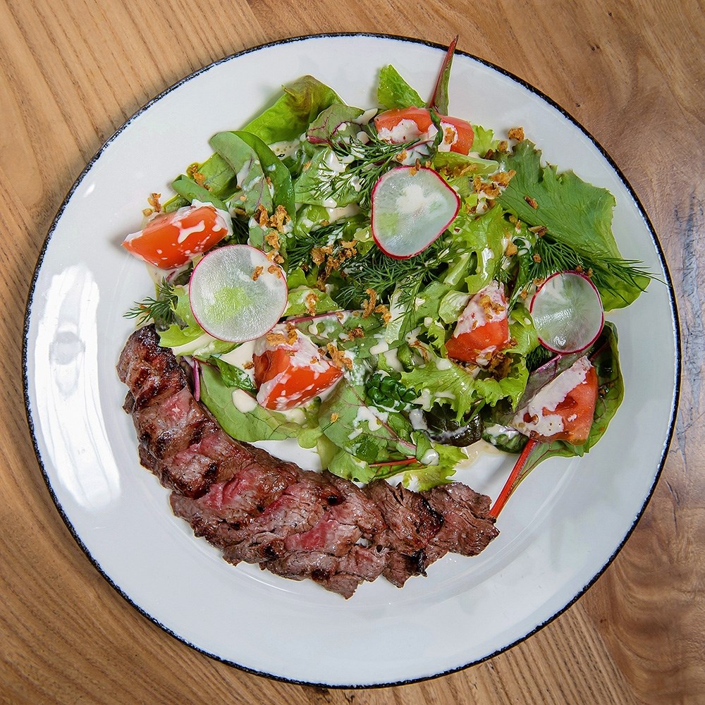 Приготовленную су-вид вырезку обжариваем в хоспере. Подаём с соусом песто, миксом салата, томатами, оливковым маслом, соусом понзу, луковым соусом и луком фри.